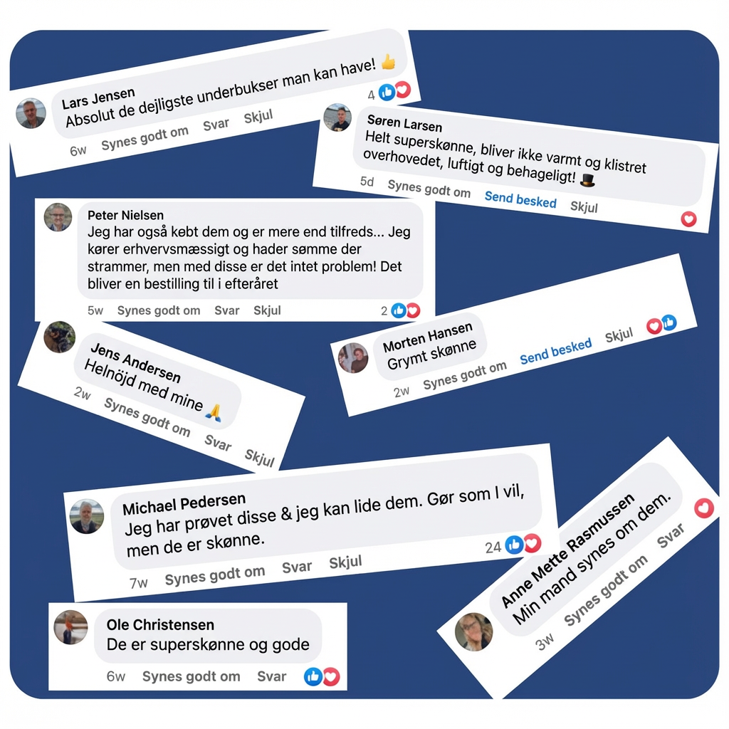 I butikkerne betaler du 100-150 kr for et par underbukser, der mister deres form efter tre vaske. Vi sælger direkte til dig – ingen mellemhandlere, ingen butiksfortjeneste.
